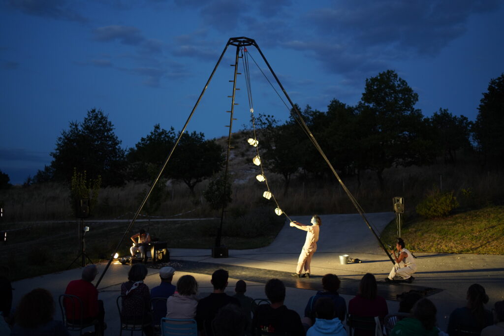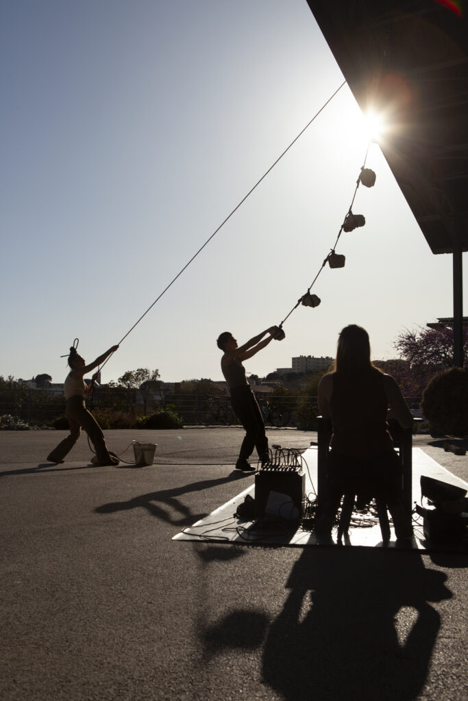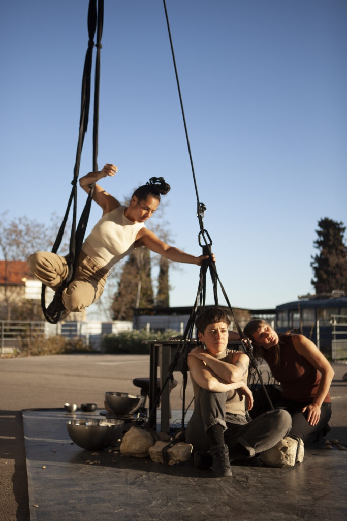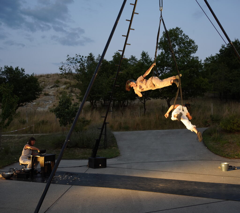 Deux acrobates et une musicienne tissent un univers minimal composé de strates vocales et minérales. Les vibrations brutes, sableuses et rocailleuses s’improvisent sur ce mouvement aérien. Tractions, suspensions, balanciers, la mécanique de contrepoids s’enclenche.