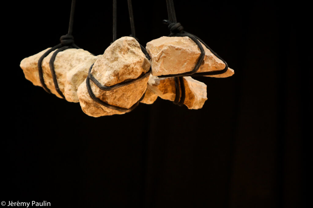Pierres, corps, sangles et sons s’entremêlent. Ces éléments sont chacun à leur tour, les uns pour les autres, des partenaires de jeux, des ancrages.